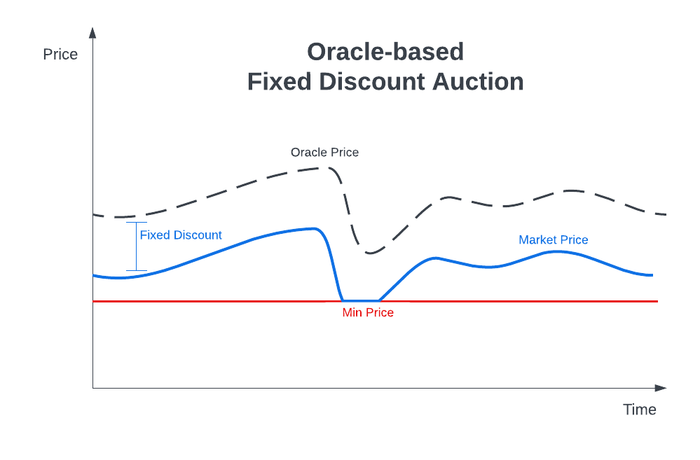 Oracle Fixed Discount Auctioneer allows market creators to sell tokens at a discount to a price provided by an oracle, likely in exchange for vesting the tokens over a certain amount of time. Typically, longer duration vesting will require a larger discount. Additionally, larger discounts may be required for smaller cap tokens or when market demand is low. Unlike the SDA auction variants, it will not adjust price to sell out the capacity over the duration.